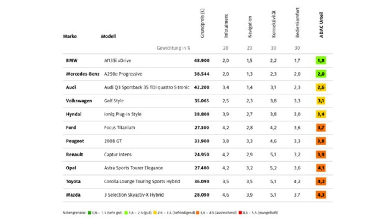 Sprachsteuerung, staufreie Navigation sowie ein vielseitiges Infotainment-Angebot sind vom Smartphone bekannt und werden vom Nutzer auch zunehmend im Fahrzeug verlangt. Allerdings erhöhen zusätzliche Funktionen und komplexe Menüstrukturen das Ablenkungspotenzial im Straßenverkehr. Der ADAC testete elf Pkw der Kompaktklasse zusammen mit der Connect und dem Unternehmen Umlaut und ermittelte dabei, welches Fahrzeug das beste Konzept aus Funktionsumfang und Bedienbarkeit bietet. Untersucht wurden die Fahrzeuge BMW M135i xDrive, Mercedes-Benz A250e, Audi Q3 Sportback, Volkswagen Golf VIII, Hyundai Iconiq Plug-In, Ford Focus Titanium, Peugeot 2008 GT, Renault Capture, Opel Astra Sports Tourer Elegance, Toyota Corolla Lounge Touring Sports Hybrid und Mazda 3 Selection Skyaktiv-X Hybrid.