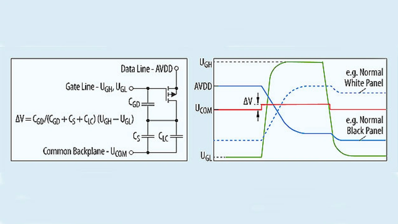Image Sticking entsteht durch die parasitäre Kapazität des TFT, die sich zwischen Gate und Drain des TFT befindet (auch als Miller-Kapazität CGD bezeichnet). Wenn der TFT abschaltet, bilden CGD, CLC und CS einen kapazitiven Spannungsteiler, was zu einem Spannungsabfall an der LC-Kombination führt. Je steiler die fallende Flanke ist, umso höher ist die zurückbleibende DC-Komponente am Flüssigkristall – was sich durch Image Sticking äußert. UCOM kompensiert den Spannungsabfall und stellt die Spannung auf die Mitte der Pixelspannung zum Zeitpunkt des Zustandswechsels ein – siehe rote Linie (Bild 6).