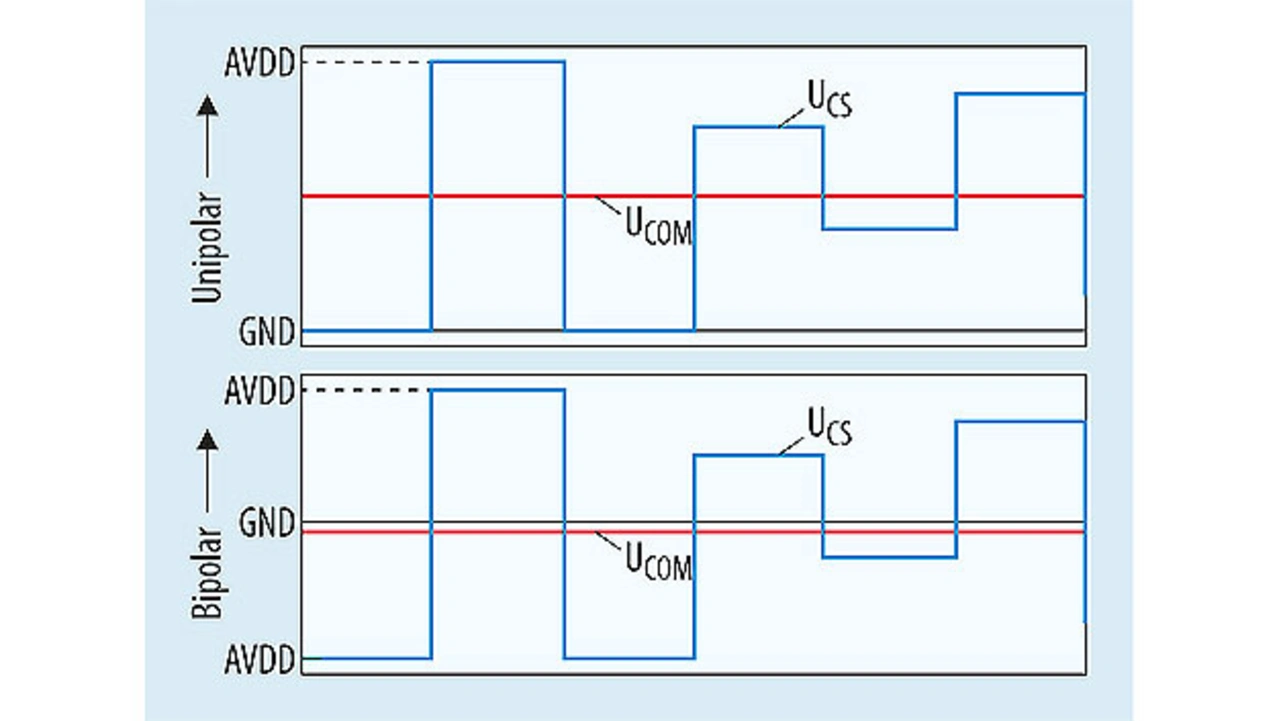 Die von einem Aufwärtswandler bereitgestellte Spannung AVDD ist die größte am Flüssigkristall anliegende Treiberspannung und versorgt in der Regel auch die gemeinsame Backplane-Spannung UCOM. AVDD ist direkt mit der Information verbunden, die das Bild wiedergibt, und stellt deshalb sehr strikte elektrische Anforderungen. Zu den Kriterien für AVDD gehören eine geringe Spannungswelligkeit, eine hohe Immunität gegen Leitungs- und Lasttransienten und genügend Strom zur Versorgung des Source-Treibers. Elektrische Störungen müssen minimiert werden, da andernfalls der Gleichstromanteil des Flüssigkristalls ein unerwünschtes Flackern verursachen würde. Die Source-Treiberspannung kann bipolar oder unipolar konfiguriert werden (Bild 5). Bei Panels mit bipolarer AVDD-Struktur liegt UCOM unter dem Massepotenzial, um die parasitären Kapazitäten zu kompensieren.