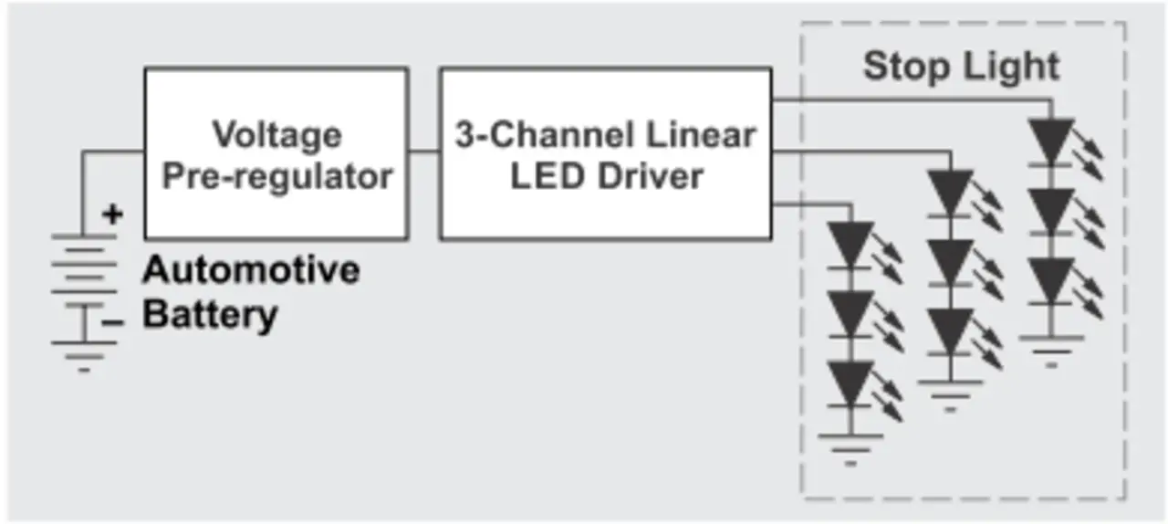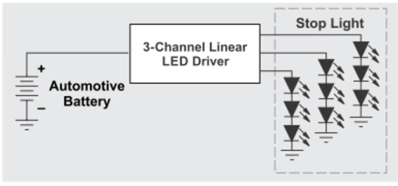 Im Automobilbereich wird der Einsatz von LEDs beispielsweise für Front- und Heckleuchten immer beliebter. Die dabei verwendeten LED-Treiberschaltungen sind so ausgelegt, dass sie einen konstanten Strom liefern. In der Regel benötigen die in modernen Kfz-Heckleuchten verwendeten LEDs einen Strom von weniger als 150 mA, was in Verbindung mit EMI- und Kostenerwägungen dazu führt, dass lineare LED-Treiber hier attraktiver sind als getaktete Regler.