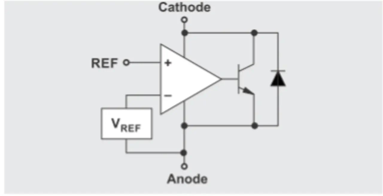 Der TL431LI-Q1 verbindet eine Spannungsreferenz mit einem internen Fehlerverstärker, sodass der Baustein eine Referenzspannung zur Verfügung stellen und seinen Ausgang regeln kann. Die Ersatzschaltung des Bausteins ist in Bild 4 dargestellt.