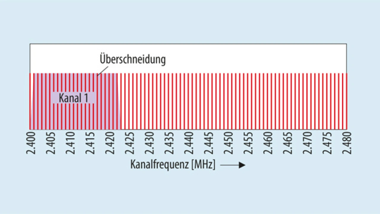 das Spektrum nutzen. Bluetooth hat 79 Kanäle zu je 1 MHz im Bereich zwischen 2,402 GHz und 2,480 GHz. Wi-Fi belegt im selben Frequenzbereich Kanäle mit 20/22 MHz. Bild 2 zeigt, was passiert, wenn sowohl Bluetooth (rot) als auch Wi-Fi (blau) versuchen, auf Kanälen mit den gleichen Frequenzen zu kommunizieren.