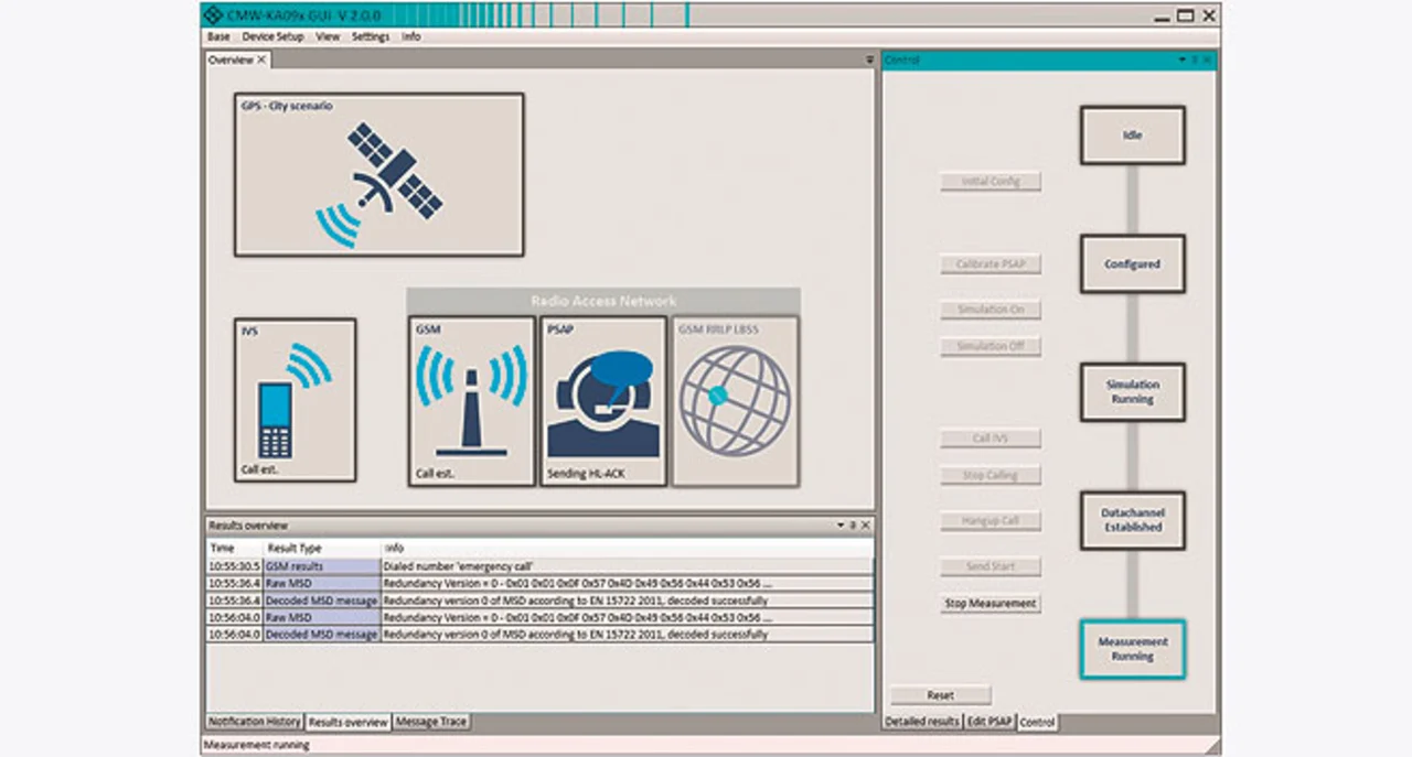 Das Messsystem leistet aber mehr als einen schlichten „Pass/Fail“-Test. Es misst und protokolliert alle relevanten Parameter. Darüber hinaus kann der Anwender damit die drei Systemkomponenten PSAP-Simulation, Mobilfunknetz-Simulation und GNSS-Simulation beeinflussen, um Spezialfälle zu untersuchen und jeden gewünschten Betriebszustand herbeizuführen