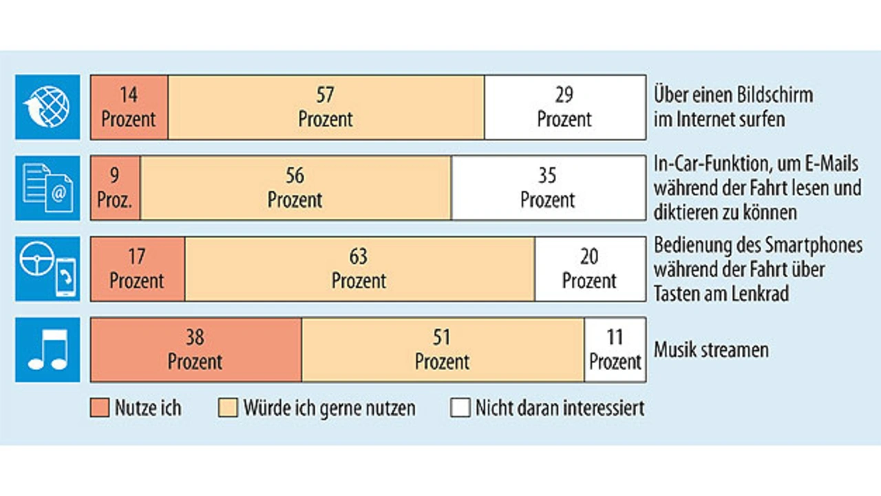 Während Fahrerassistenzsysteme den Fahrer heute umfangreich unterstützen, zeigt eine Studie von Accenture, dass auch großes Interesse daran besteht, während der Fahrt im Internet zu surfen, E-Mails lesen und diktieren zu können oder Musik zu streamen. Die Studie zeigt sogar, dass Fahrzeugtechnik wie das Multimedia-System oftmals den Kauf mehr beeinflusst als die Fahrzeugleistung, wie Bild 1 verdeutlicht.