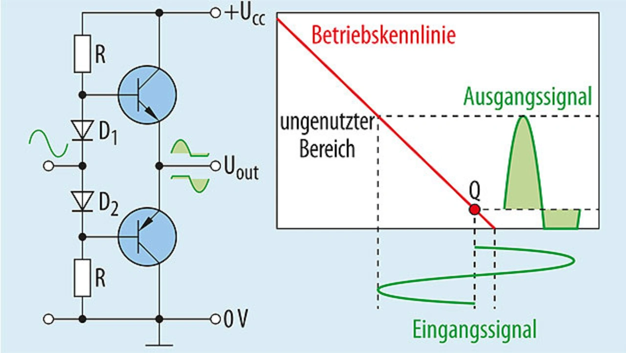 Auf der Suche nach originalgetreuer Wiedergabe, Leistungs- und Effizienzsteigerung wurden im Laufe der Jahre verschiedene Verstärkerklassen entwickelt. Die Klasse AB und die hocheffiziente Klasse D sind eine Weiterentwicklung der Klassen A und B, wobei Klasse-AB-Verstärker (Bild 2) ebenfalls als hocheffiziente Varianten zur Verfügung stehen. Weil Klasse-AB-Verstärker die Transistoren jedoch grundsätzlich in ihrem linearen Bereich betreiben, ist deren Wirkungsgrad gedeckelt.