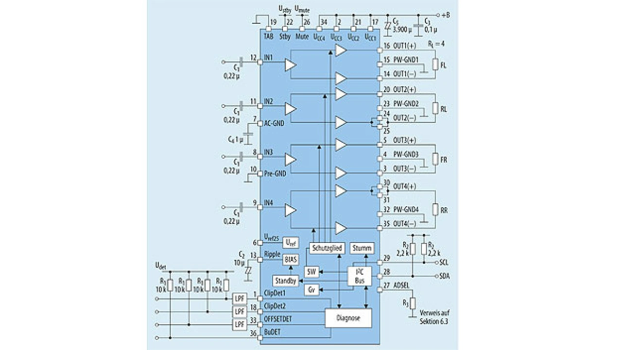 Die Vorteile der Klasse-TB-Technologie lassen sich durch einen Audioverstärker wie dem TCB701FNG (Bild 4) von Toshiba realisieren. Der Baustein hat vier Audiokanäle mit einer Ausgangsleistung von 49 W und verfügt über eine inte¬grierte Diagnosefunktionen. Seine -Robustheit gegenüber elektromagnetischen Störungen verringert die Zahl der erforderlichen externen Bauelemente. Zudem sind LC-Filter überflüssig.