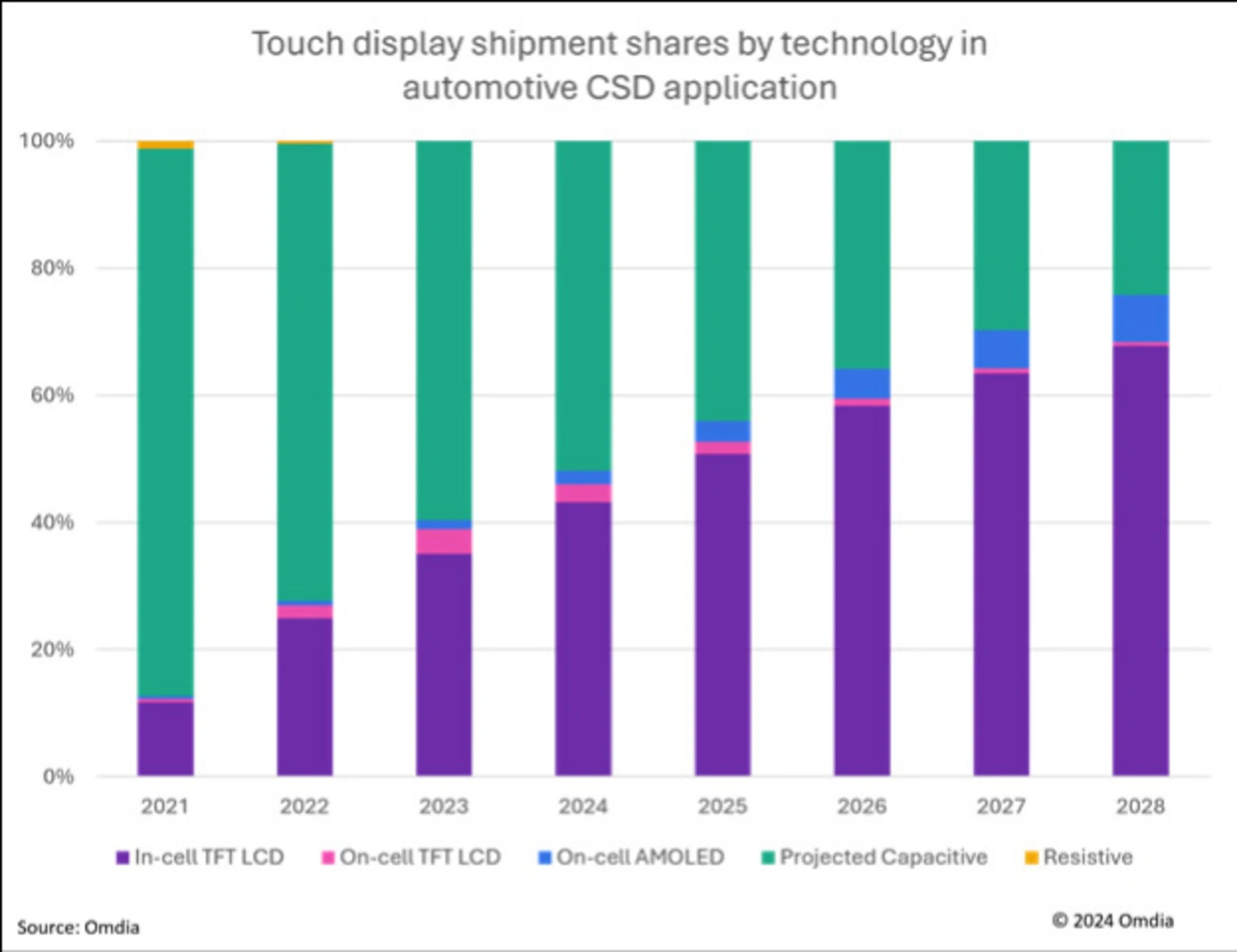 In den Mittelkonsolen-Displays neu produzierter Fahrzeuge deutet sich ein Systemwechsel an. Bislang dominieren hier noch projiziert-kapazitive Touch-Displays mit separaten Berührungssensoren und Displaydesigns, die laut Omdia 2021 noch einen Marktanteil von 81 Prozent in diesem Markt innehatten. Zuletzt flachte das Wachstum jedoch deutlich ab. Stattdessen ordern die Hersteller den Analysten zufolge nun zunehmend Panels mit In-Cell-Touch-Technologie als Center-Stack-Displays (CSD), die Berührungssensoren in das Display selbst eingebettet sind. Im vergangenen Jahr wurden diese mit einem Auslieferungsvolumen von 26,2 Millionen Stück bereits in mehr als einem Drittel der Fahrzeuge verbaut (35,1 Prozent), 2024 sollen sie laut der Prognose schon mehr als 40 Prozent der Bestellungen ausmachen. Schon 2025 rechnet Omdia dann damit, dass mehr als die Hälfte aller CSD-Orders aus dem Automotive-Segment auf In-Cell-Touch-TFT-LCD-Displays entfallen.