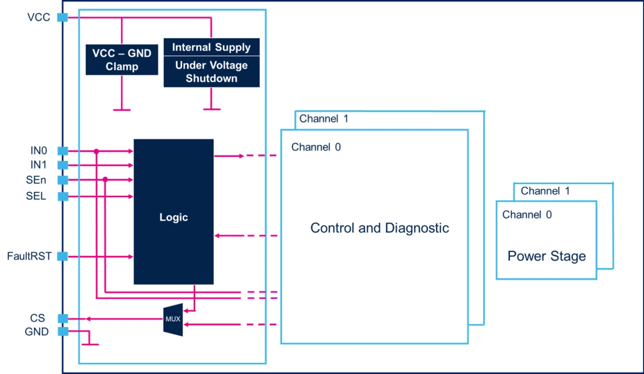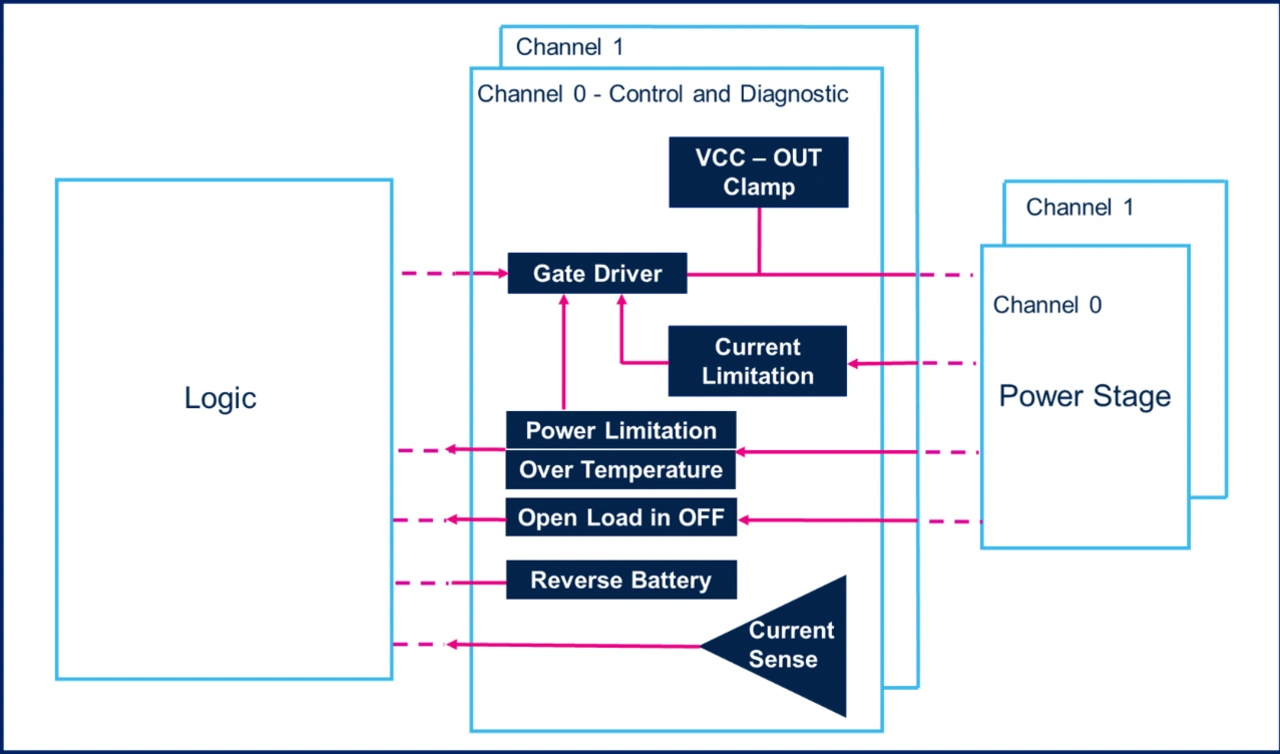 Ein Blockschaltbild des Logikteils eines smarten, zweikanaligen M0-9-HSD ist in Bild 3 zu sehen. Der smarte Schalter kann zwei Kanäle unabhängig voneinander, mit hoher Genauigkeit und mit geringem Strombedarf steuern. An seinen vier Eingangs-Pins kann er Befehle von einem Mikrocontroller entgegennehmen und so den Belangen der Anwendung gerecht werden.