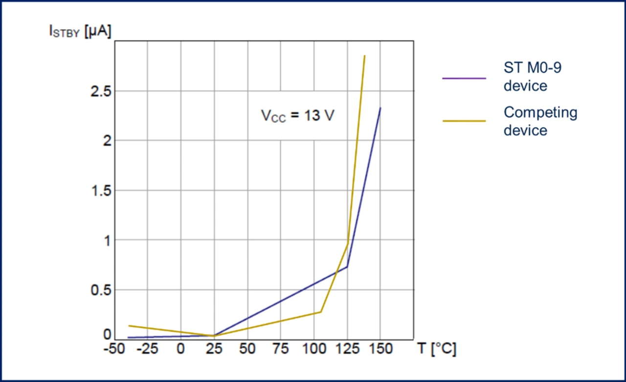 Die Erfüllung dieser Norm ist ein bedeutender Vorteil der ST-Technologie, denn hierdurch ist sichergestellt, dass die Bauelemente auch unter besonders anspruchsvollen Bedingungen zuverlässig arbeiten und die erforderliche Funktionalität bieten. Die Mindestspannungs-Spezifikation von 2,7 V (als Höchstwert) für den Kaltstart ist die niedrigste aller konkurrierenden Bauelemente und stellt eine 10-prozentige Verbesserung dar. Anders ausgedrückt, sind die M0-9-Treiber besser gerüstet, um den beim Kaltstart des Fahrzeugmotors auftretenden Spannungseinbruch zu verkraften.