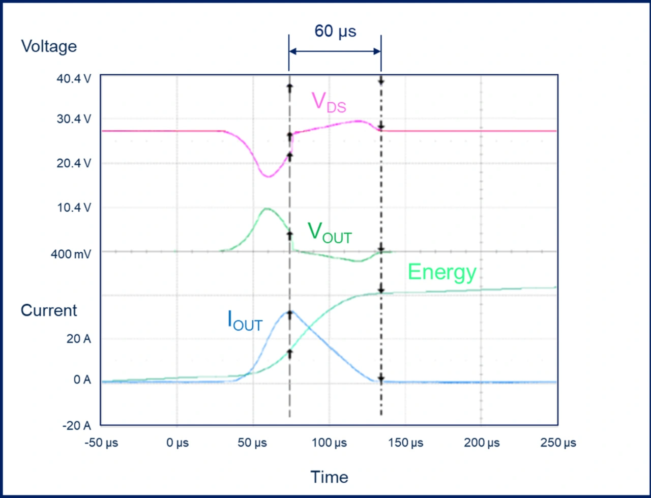 Wie den Versuchsdaten zu entnehmen ist, lässt der intelligente, zweikanalige M0-9-Schalter des Typs VND9012AJ einen Strom von 33 A für eine Dauer von 60 µs zu, wobei eine Energie von 26 mJ dissipiert wird, wenn die Batteriespannung 28 V erreicht.