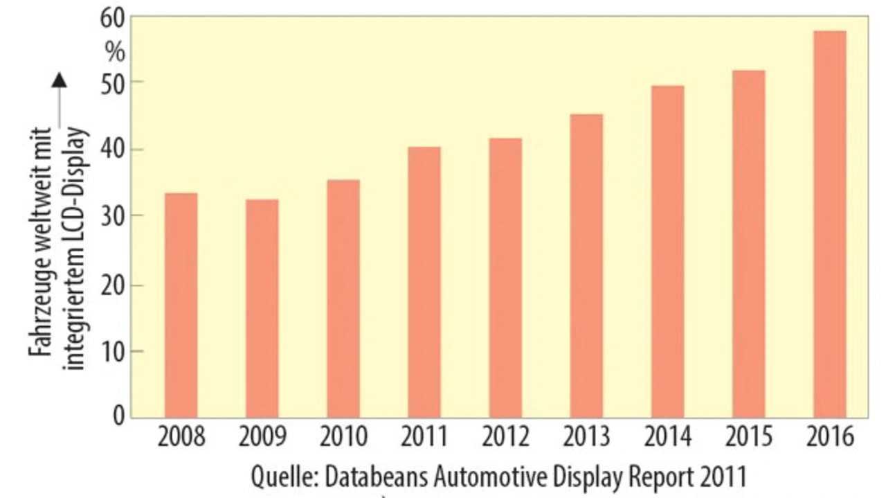 Die kombinierte Schubkraft aller dieser Entwicklungen bewirkt, dass der Anteil von Fahrzeugen, die über integrierte LCD-Bildschirme verfügen, weltweit mit einer jährlichen Rate von mehr als 7 Prozent steigt. Um 2015 wird mehr als die Hälfte aller Fahrzeuge mit einem oder mehreren LCD-Displays ausgestattet sein (Bild 1).