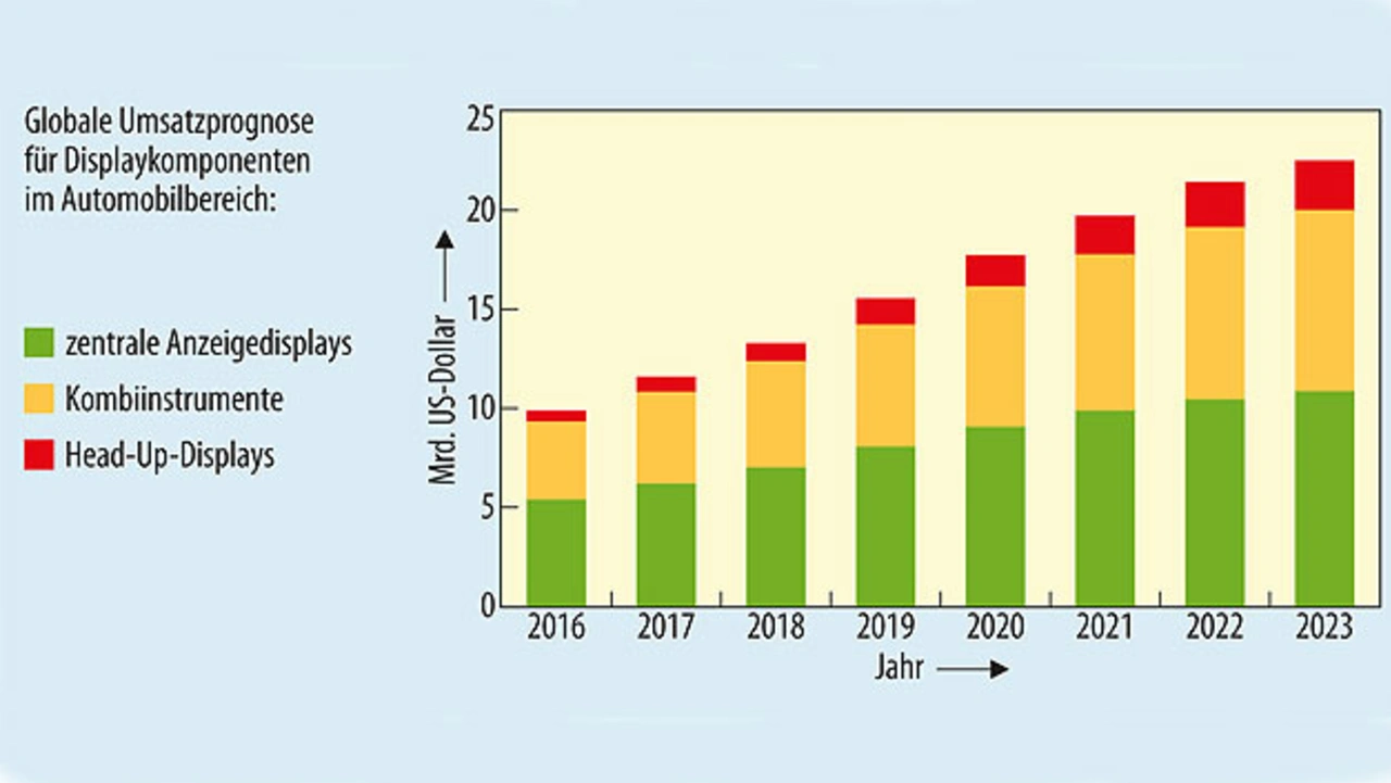 Automatisierung, Sicherheit und Konnektivität spielen bei Designs für Fahrzeuginnenräume eine immer größere Rolle und führen zu einem rasanten Anwachsen der verwendeten DisplayFlächen. Dazu gehören herkömmliche Display-Anwendungen, wie beispielsweise auf der Mittelkonsole und dem Armaturenbrett, aber auch eine Vielzahl neuer Einsatzmöglichkeiten (Bild 1).
