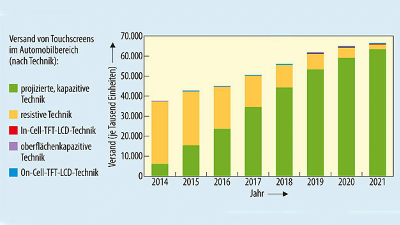 Studien von IHS Markit zeigen, dass Benutzer Touch-Bildschirme allen anderen Eingabearten vorziehen [2]. Im Gegensatz dazu sind physische Tasten der unbeliebteste Eingabemodus. Somit verdrängen Touch-Displays zunehmend die Tasten als Eingabemöglichkeit. Gerade Anwendungen, die nicht nur der Informationsvermittlung sondern als Mensch-Maschine-Schnittstelle dienen, sind für das Ausbreiten von formbaren Touch-Displays im Fahrzeuginnenraum verantwortlich (Bild 2). Künftig sind auch Fahrzeuginnenräume vorstellbar, in denen jeder Schaltknopf und jede Taste durch ein Touch-Display ersetzt wurde. Hier wird jeder Aspekt der HMI individuell und anwendungsspezifisch gestaltet, erweitert und konfiguriert.