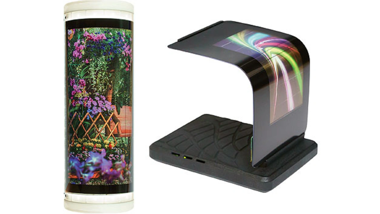 Die OLCDs haben einen Biege¬radius von weniger als 20 mm und sind somit viermal dünner (mit einer Stärke von weniger als 0,3 mm) und wiegen weniger als ein Zehntel herkömmlicher Displays auf Glasbasis (Bild 4).