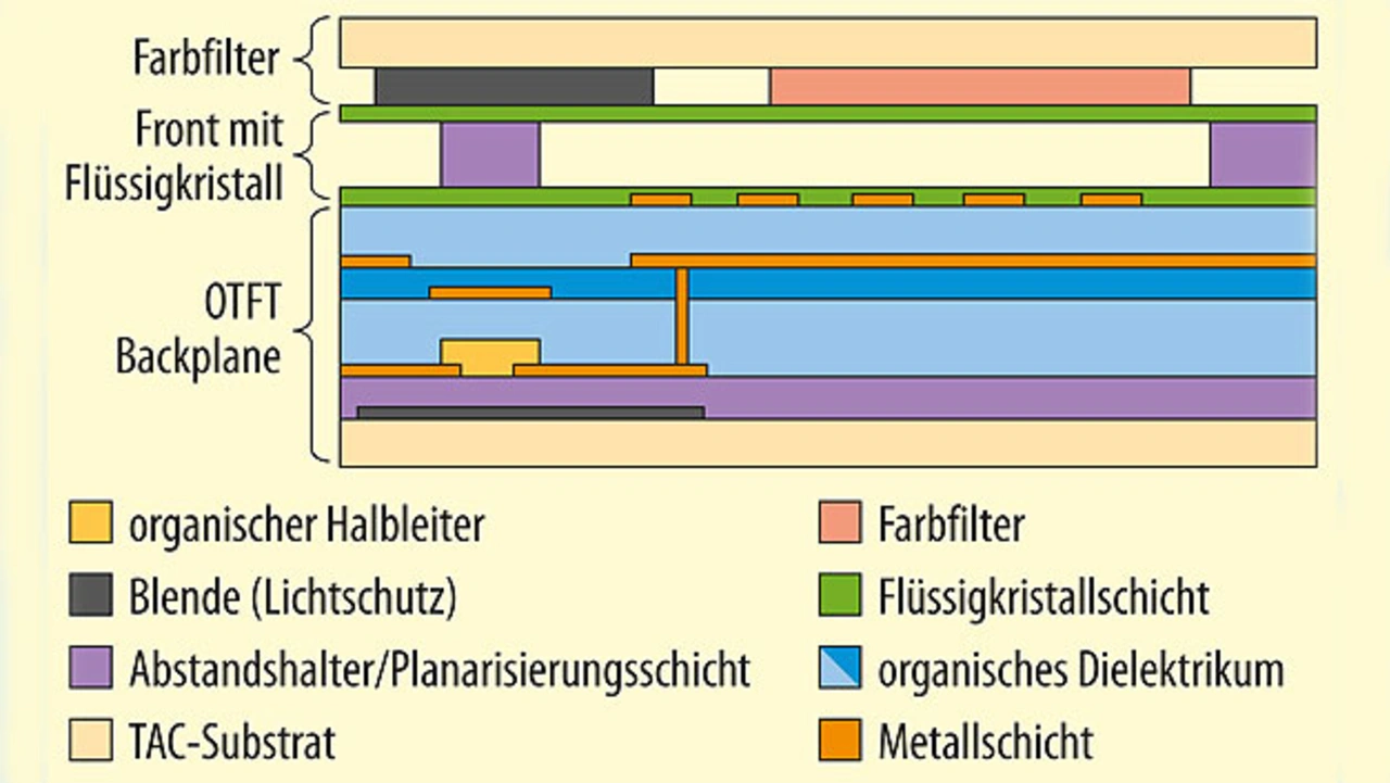 Aktivmatrix-Liquid-Crystal-Displays (LCD) mit Dünnfilmtransistoren (TFT, Thin-Film-Transistor) aus amorphem Silizium werden bereits heute mit großem Erfolg in der Automobilindustrie eingesetzt. Allerdings stößt der Einsatz von Glas in Bezug auf Bieg- und Formbarkeit rasch an Grenzen. Die Vision der Produktdesigner lautet allerdings, Displays an die gewölbten Oberflächen und Formen im Fahrzeuginnenraum anzupassen. Organische LCDs (OLCDs), die eine organische TFT (OTFT)-Rückwand mit einer flexiblen LCD-Frontplane kombinieren, ermöglichen diese Vision.