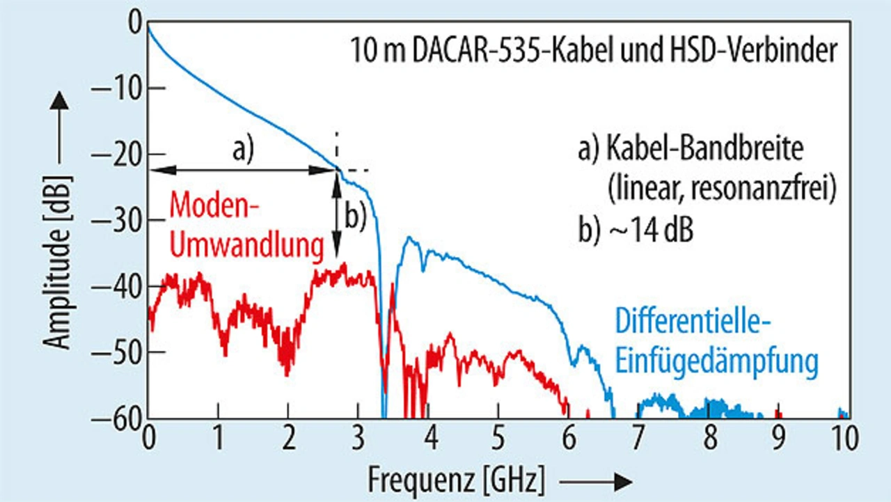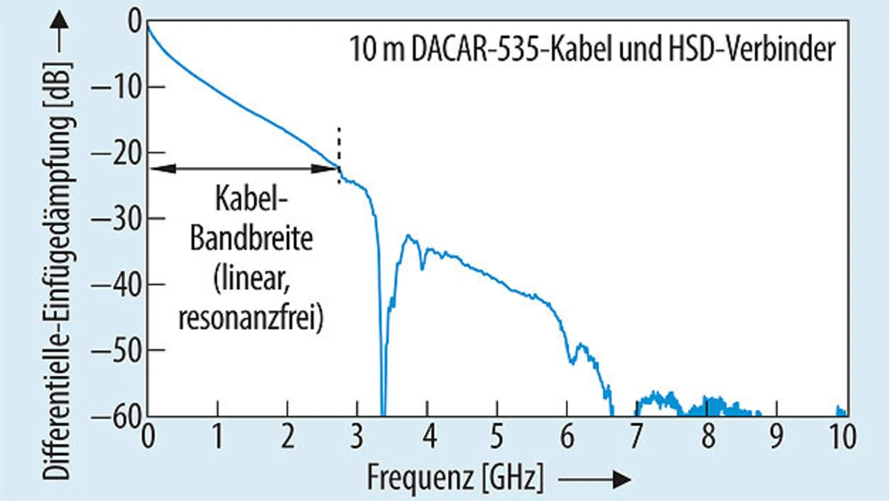 Wie Bild 8 erkennen lässt, besitzt ein 15 m langes Koaxial-Kabel eine nutzbare Bandbreite von 3 GHz und kann Datenraten bis etwa 6 Gbit/s unterstützen. Bild 9 zeigt die Einfügedämpfung eines differentiellen STQ-Kabels. Wie man sieht, gibt es einen abrupten Einbruch in der Dämpfungskurve, der durch die Verdrillungs-Eigenschaften der Leiter verursacht wird. Das 10 m lange differentielle Kabel weist eine nutzbare Bandbreite von 2,5 GHz auf und unterstützt Datenraten bis rund