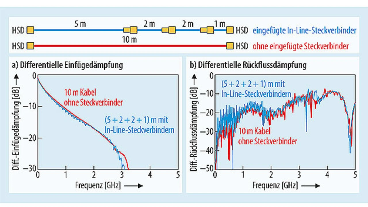 Aus Impedanz-Unstimmigkeiten resultierende reflektierte Signale können auch zu gewissen Schwankungen der Einfügedämpfung führen. Wie sich In-Line-Steckverbinder im Vergleich zu einem gleich langen reinen Kabel auf die Rückfluss- und Einfügedämpfung auswirken, ist aus Bild 14 zu entnehmen.