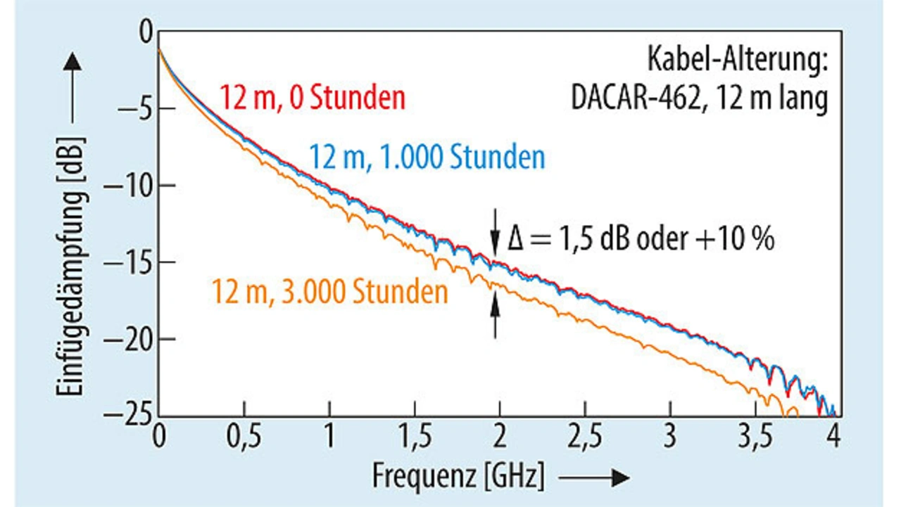 Die Einfügedämpfung ist ein weiterer wichtiger Parameter konfektionierter Kabel, der angibt, welcher Dämpfung ein Signal auf dem Weg vom Sender zum Empfänger unterliegt. Bild 8 gibt die Dämpfungseigenschaften eines 15 m langen Koaxial-Kabels wieder.