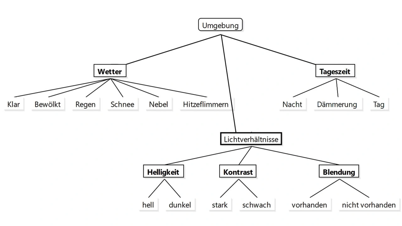 Eine geeignete Methode ist die Klassifikationsbaumanalyse. Die Pfade des Baumes beschreiben in Kategorien geordnete Umgebungsvariablen und Fehlerquellen (Bild 1). Sinnvolle Kategorien bei einem im Straßen- oder Zugverkehr eingesetzten System sind beispielsweise die Wetter- und Lichtverhältnisse, Bewegungsstörungen sowie Kamerahard- und -softwarefehler.