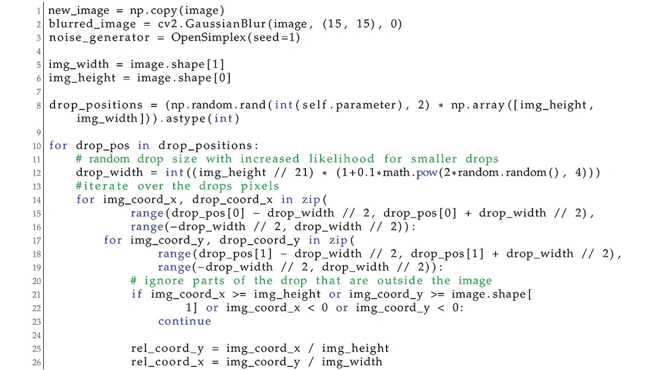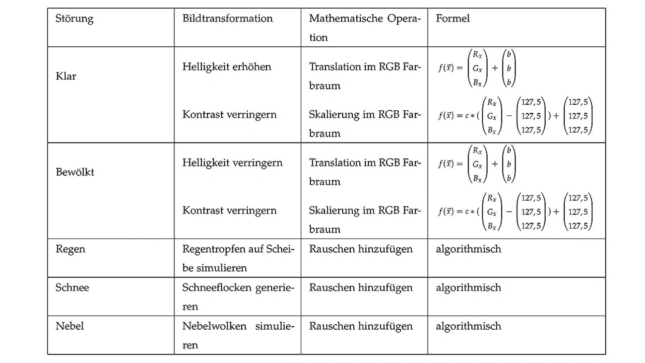 Um zu evaluieren, inwieweit metamorphe Transformationen ein Objekterkennungssystem stören können, wurden weitere Veränderungsalgorithmen implementiert. Darunter simple Effekte wie die Verdunklung des Bildes, aber auch komplexe Wettereffekte wie Hitzeflimmern, Nebel oder Schnee.