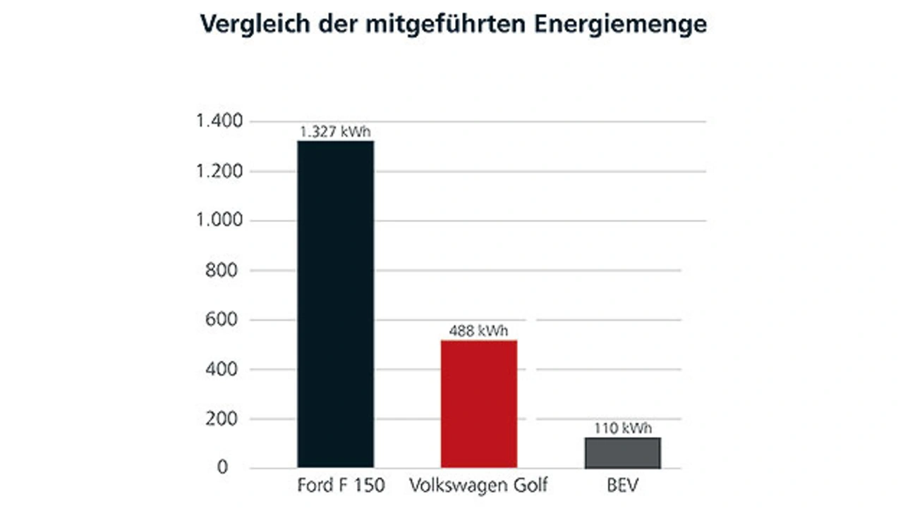 In elektrische Dimensionen umgerechnet, kann ein Volkswagen Golf der achten Generation (Modelljahr 2021) mit dem serienmäßig vorhandenen 50-Liter-Tank 488 kWh an Energie mit sich mitführen (1 Liter Benzin ≈ 9,76 kWh). Das in Nordamerika bestverkaufte Fahrzeug, der Ford F150, kann in einer optionalen Ausführung des Modelljahres 2021 bis zu 36 US liquid gallons (136 Liter) mit sich führen. Dies entspricht einer beeindruckenden Menge von 1327 kWh.