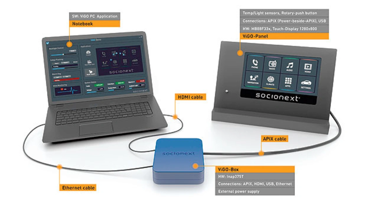 Die hier vorgestellte Systemlösung, die die Implementierung einer ASIL-konformen zentralisierten Display-Architektur ermöglicht, wurde bereits in einem Demosystem namens „ViGO“ umgesetzt (Bild 7). Basierend auf Inovas Transmitter-Chip INAP375T und dem Indigo2 Display SoC demonstriert das System die Implementierung typische Sicherheitsfunktionen. In beispielhaften Implementierungen finden sich aber nicht nur ASIL-relevante Sicherheitsfunktionen, sondern auch Komfortfunktionen, wie die Steuerung eines Touch-Bildschirms.