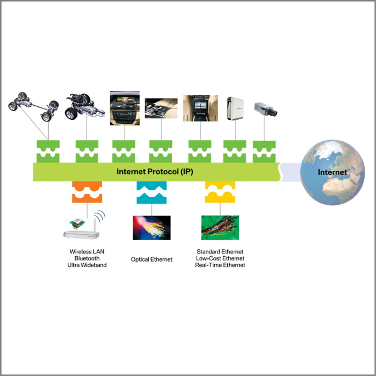 Damit die steigenden Anforderungen an das zukünftige Fahrzeugbordnetz Realität werden können, hat die BMW Forschung und Technik GmbH einen neuen Weg erdacht: Der weltweit einheitliche Kommunikationsstandard Internet Protocol wurde in einem Fahrzeug umgesetzt.