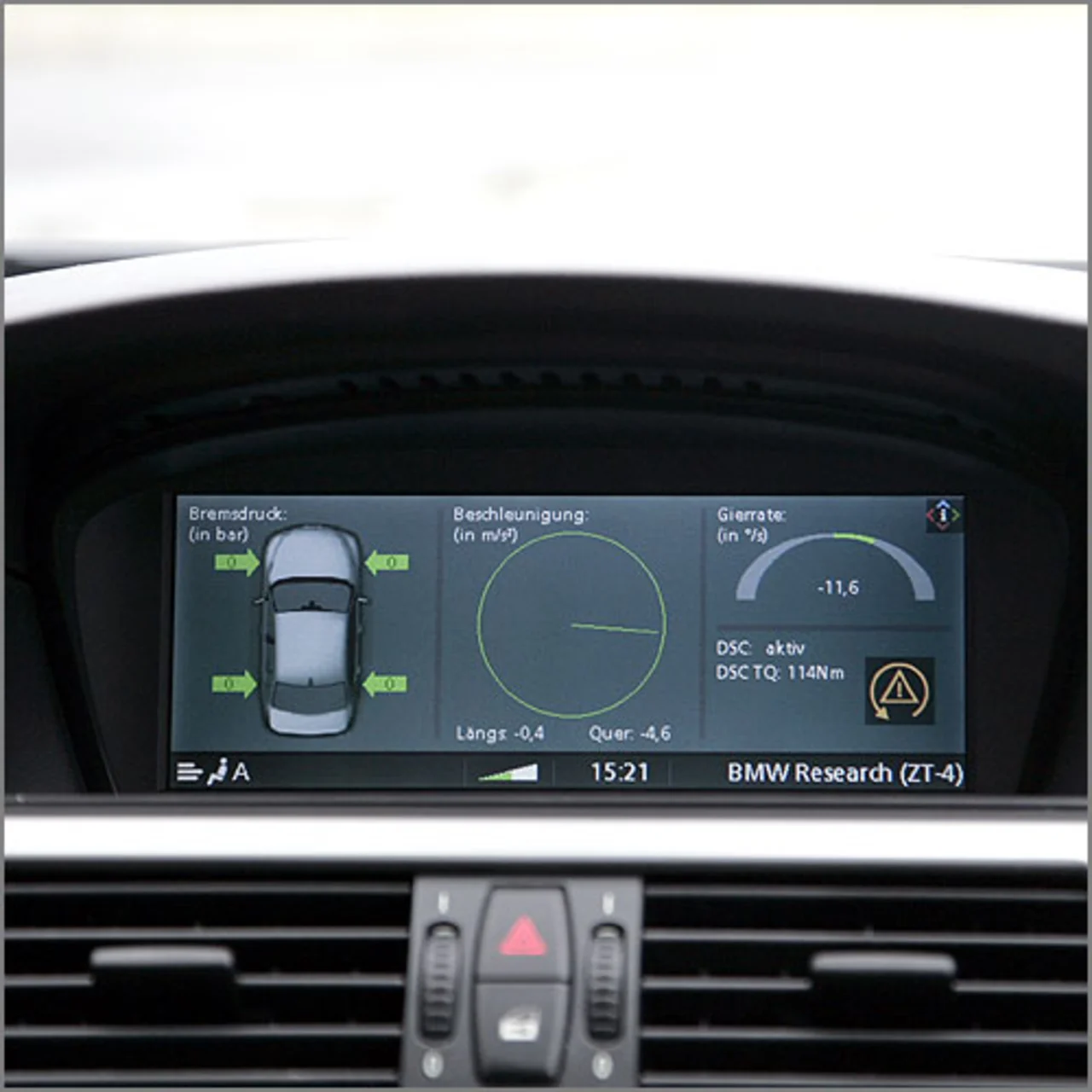 Neben den Infotainment/Multimedia-Szenarien wurde auch der Zugriff auf fahrzeuginterne Daten sowie die Echtzeit-Kommunikation realisiert. Über IP können beliebige fahrzeugrelevante Daten ausgelesen und eingespeist werden. Um die Echtzeit-Fähigkeit zu demonstrieren, wurde die CANVerbindung zwischen dem Fahrregelsystem Dynamic Stability Control (DSC) und der digitalen Motorelektronik unterbrochen und die Daten über das Internet Protocol übertragen. Bei Fahrtests auf der BMW-Teststrecke konnte gezeigt werden, dass die Regelung selbst in Grenzbereichen über IP fehlerfrei funktioniert, selbst wenn parallel mehrere Multimedia-Datenströme über die gleiche Leitung übertragen werden (Bild 4).
