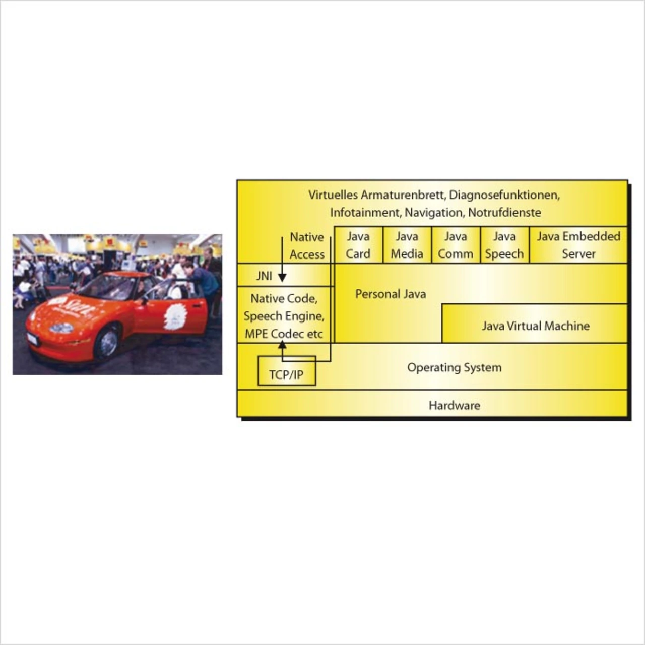 Noch im Jahrtausendwechsel argumentierte die Automobilindustrie, dass Netzwerke der IT-Technologie in Kraftfahrzeugen nicht die nötige Stabilität und Verfügbarkeit haben. IP war dem entsprechend kein Thema für den Einsatz im Kraftfahrzeug. Der Software-Hersteller Sun bewies jedoch 1999 durch die Sun Microsystems Laboratories mit einem Forschungsfahrzeug vom Typ GM EV1, dass IP-Technologie mit Java sehr wohl eine berechtigte Existenz in Fahrzeugen haben kann [1]. Mit einer innovativen Systemarchitektur vernetzte das Fahrzeug alle relevanten Komponenten bis hin zu einer echten Plug-in-Architektur, die eine weitgehende Hard- und Software-Skalierung des Fahrzeugs zuließ (Bild 8).