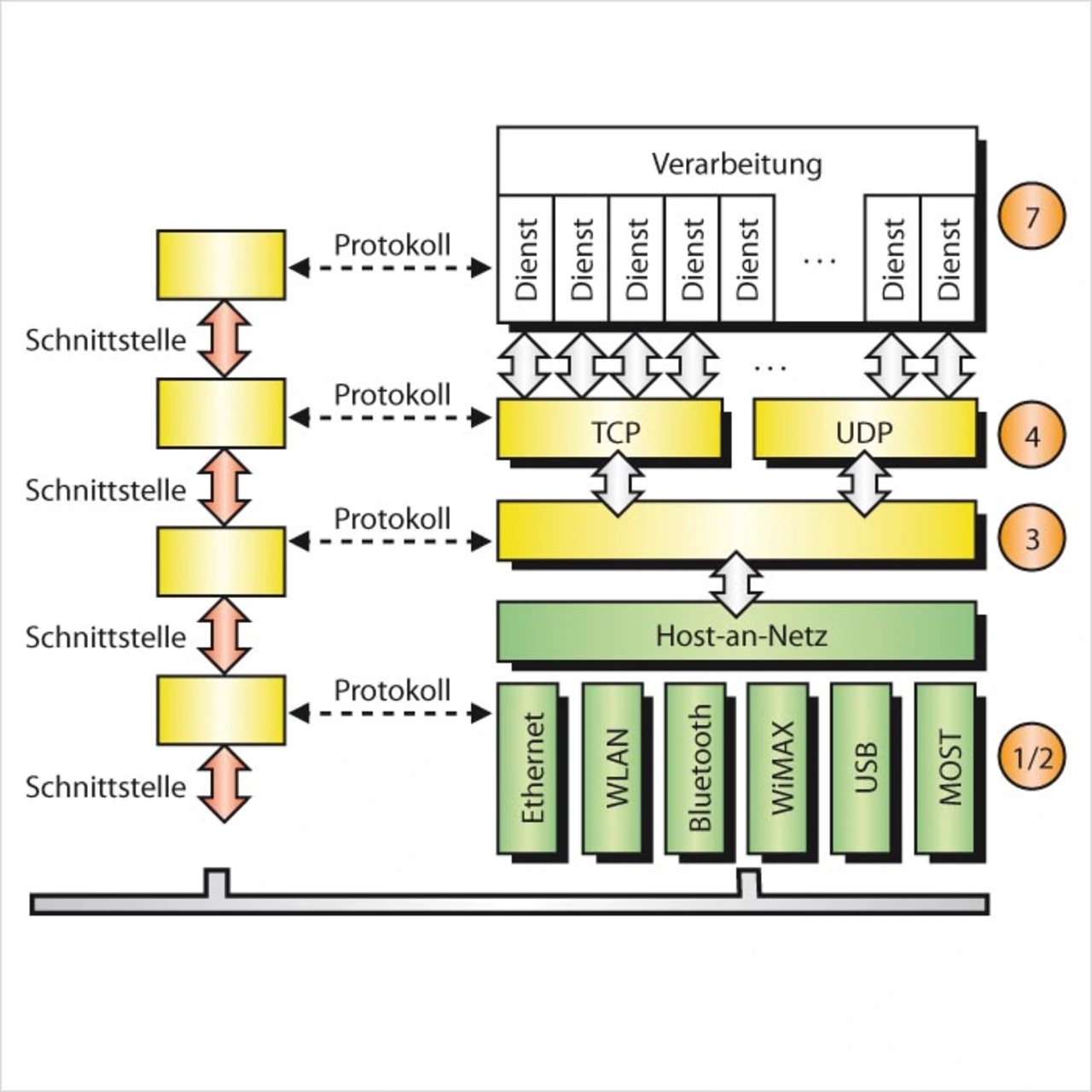 Kern des Erfolges der IP-Technologie in der Informationstechnik war die Realisierung eines hardware-unabhängigen Schichtenmodells, welches eine standardisierte Abstraktionsschicht bietet. Durch genau definierte Schnittstellen werden Schichten austauschbar, und Protokolle ermöglichen eine horizontale Kommunikation auf einer Schichtenebene (Bild 7). Hierdurch ist eine weitreichende Abstraktion der gesamten Kommunikation möglich.