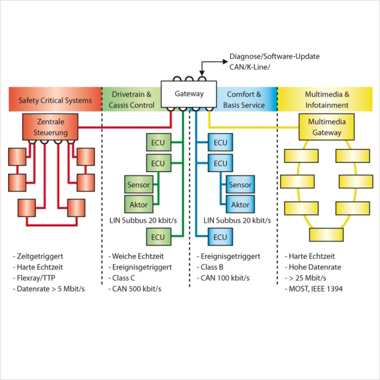 Darüber hinaus sind die Anforderungen hinsichtlich der Datenübertragungsleistung sehr unterschiedlich. Einfache Sensoren und Aktoren werden durch langsame (20 kbit/s), aber extrem kostengünstige serielle Bussysteme verbunden (LIN). Die Mehrzahl der Steuergeräte wird im Komfortbereich durch einen etwa 100 kbit/s schnellen Bus (CAN) realisiert. Für den Antriebsstrang sind deutlich schnellere Vernetzungskomponenten mit bis zu 500 kbit/s (High-Speed-CAN) bzw. 10 Mbit/s (FlexRay) notwendig.