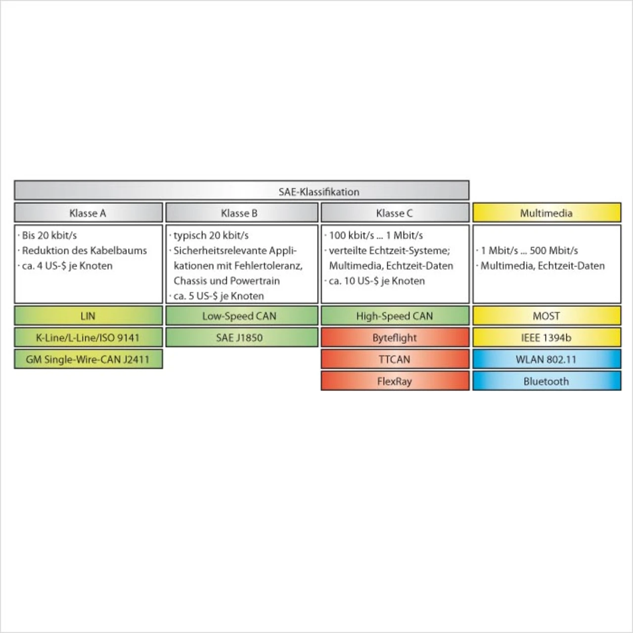 Diese Clusterung wird auch in der Klassifizierung der Automotive-Busse der SAE (Society of Automotive Engineers) deutlich (Bild 4). Bei den europäischen Automobilbauern stehen gerade CAN, LIN und FlexRay hoch im Kurs. In der Vernetzung von Multimediasystemen ist MOST aktuell das Maß der Dinge, bekommt aber gerade in Hinblick der Integration der Offboard-Geräte wie MP3-Player, iPod und Co. zunehmend durch USB und kabellose Schnittstellen wie Bluetooth, WLAN und Wireless USB Konkurrenz. Zum besseren Verständnis sind nachfolgend kurz die Charakteristika der einzelnen Bussysteme aufgezeigt.