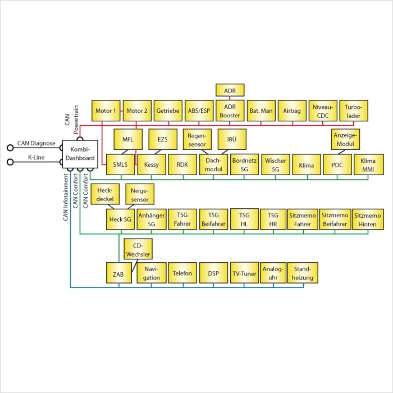 Für einen robusten Betrieb werden zwei CAN-Varianten verwendet, die sich nur durch die Transceiver-Anschaltung unterscheiden. Der Low-Speed-CAN wird im Komfort- und Infotainment-Bereich zur Vernetzung von Steuergeräten eingesetzt. Typischerweise hat er eine Übertragungsrate von etwa 100 kbit/s und eine Notbetriebsart als 1-Draht-Bus. Das bedeutet, er funktioniert auch fehlerfrei bei einem einfachen Kabelbruch.