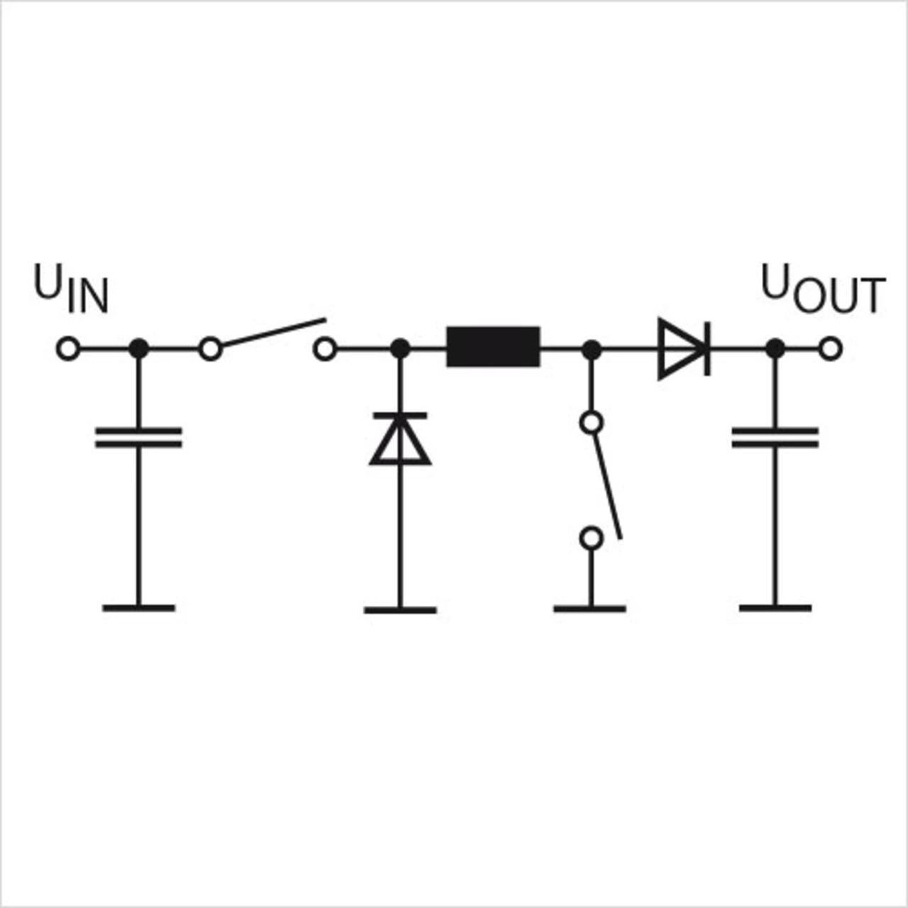 Beim asynchronen Abwärts-/Aufwärtswandler (Bild 1) werden zwei unterschiedliche Topologien miteinander kombiniert. Daher sind, anders als bei einfachen Abwärts- oder Aufwärtswandlern mit einem Schalter und einer Diode, hier zwei Schalter und zwei Dioden erforderlich. Um den Gesamtwirkungsgrad des Systems zu erhöhen, können die zwei Dioden durch Schalter ersetzt werden. Die Topologie ähnelt nun einer H-Vollbrücke mit Drossel. Die allgemeine Funktion dieser Bausteine kann in drei Betriebsarten unterteilt werden: