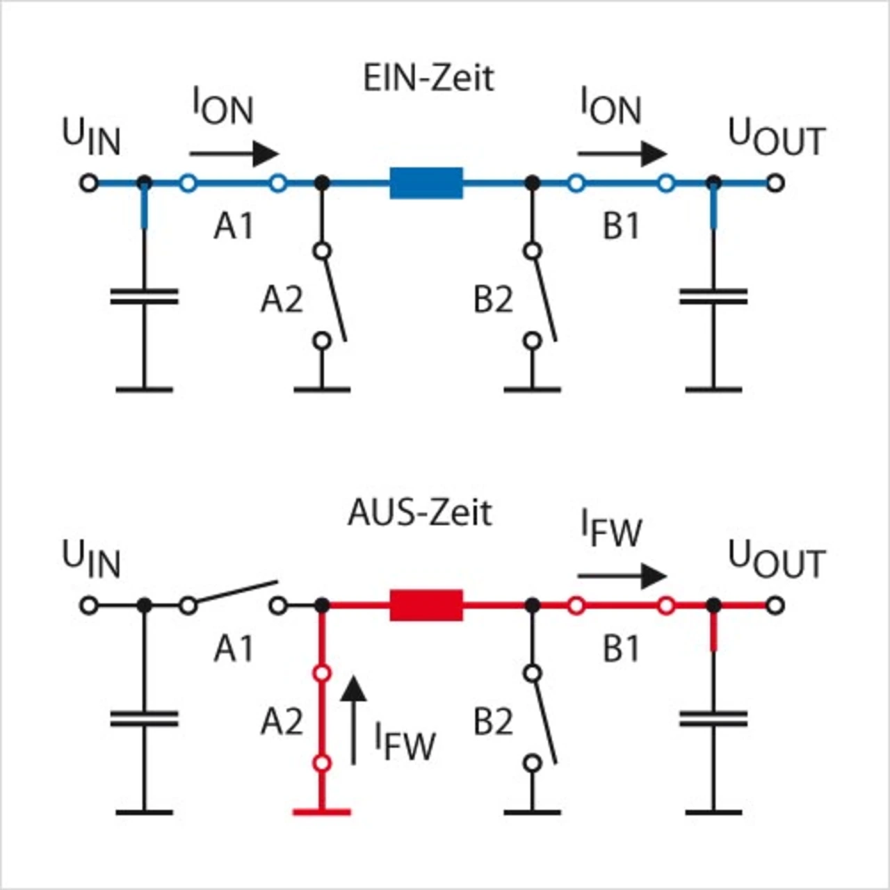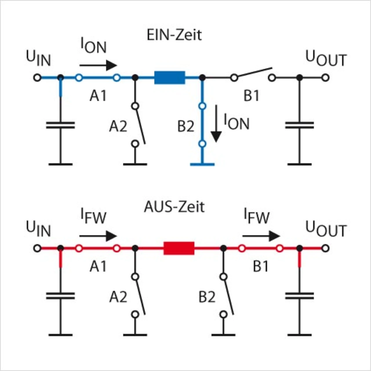 In der zweiten Phase des Zyklus (Bild 4 unten; AUS-Zeit) ist der Schalter B2 geöffnet und der Schalter B1 geschlossen. Die magnetisch aufgeladene Spule treibt einen Strom vom Eingang durch den Schalter A1, die Spule und den Schalter B1 zum Ausgangskondensator.