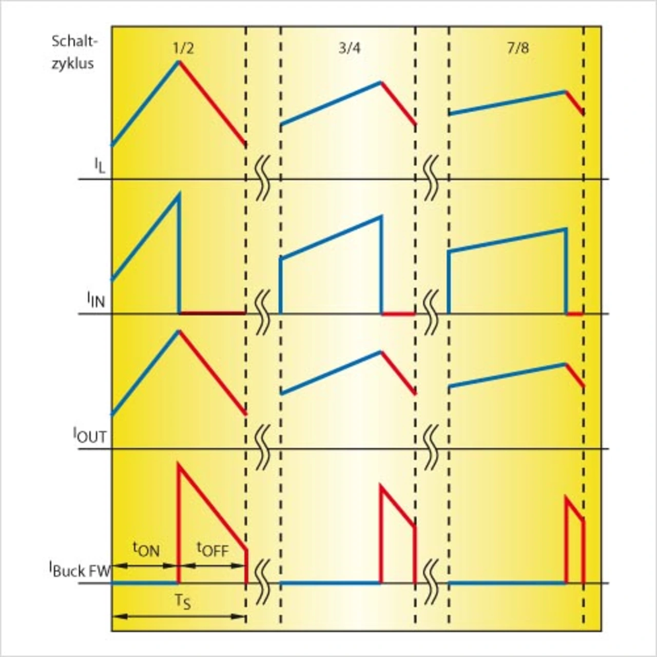 Bei einer asynchronen Topologie ist der Schalter A2 durch eine Diode als passives Freilaufelement ersetzt. Dadurch wird die Anzahl erforderlicher Treiber und FETs reduziert, gleichzeitig jedoch auch der Wirkungsgrad des Wandlers verringert. Der Schaltzyklus bei dieser Betriebsart hängt von dem in Gleichung (1) angegebenen Verhältnis zwischen Eingangs- und Ausgangsspannung ab (Bild 3).