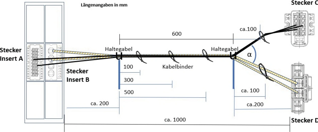 Aufgrund der positiven Erfahrungen wurde im Juli 2024 eine zweite Robotik Challenge gestartet. Dieses Mal war das Ziel die Herstellung eines Leitungssatzmodules in einer, mit manuellen Tätigkeiten vergleichbaren Zeit. Die prototypischen Montagezellen sollten einen realen Leitungssatz mit verschiedenen Stecksystemen, Kontaktteilen und Leitungen innerhalb von 180 Sekunden herstellen können. Dabei galt es, zentrale Arbeitsschritte automatisiert ohne Qualitätsverluste in Serienqualität durchzuführen. In einem skizzierten Bauplan (Bild 2) wird die Anordnung der Stecker und die Positionierung der Leitungen mit Crimp-Kontakten sowie das Routing der Leitungen dargestellt.
