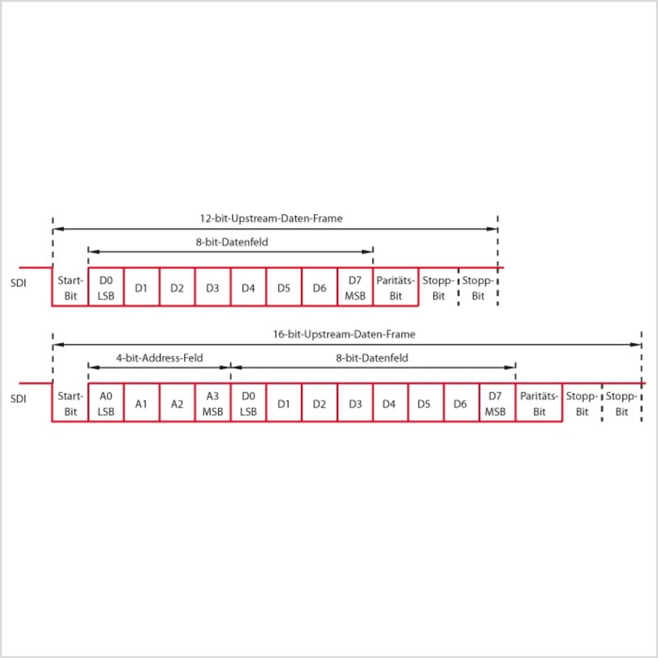 Der asynchrone Upstream-Kanal ist ein UART-kompatibler Datenstrom (Universal Asynchronous Receiver Transmitter). Er dient dazu, einen seriellen Datenstrom vom Leistungstreiber-Baustein zu empfangen. Die MSB-Upstream-Daten-Frames besteht aus den folgenden vier Teilen: