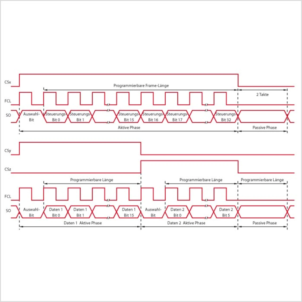 Der schnelle synchrone Downstream besteht aus einem SPI-kompatiblen programmierbaren Datenstrom mit einer Länge zwischen 2 und 34 bit. Ein Frame kann zwischen Daten und Befehlen unterscheiden (Bild 3). Die Unterscheidung erfolgt mit dem ersten gesendeten Auswahl-Bit (Select-Bit). Die Frames bestehen aus Daten, welche die PWM-Informationen von den Timer-Bausteinen zum Leistungstreiber-Baustein transferieren. Die Befehle werden benutzt, um den Leistungstreiber-Baustein zu initialisieren und zu konfigurieren.