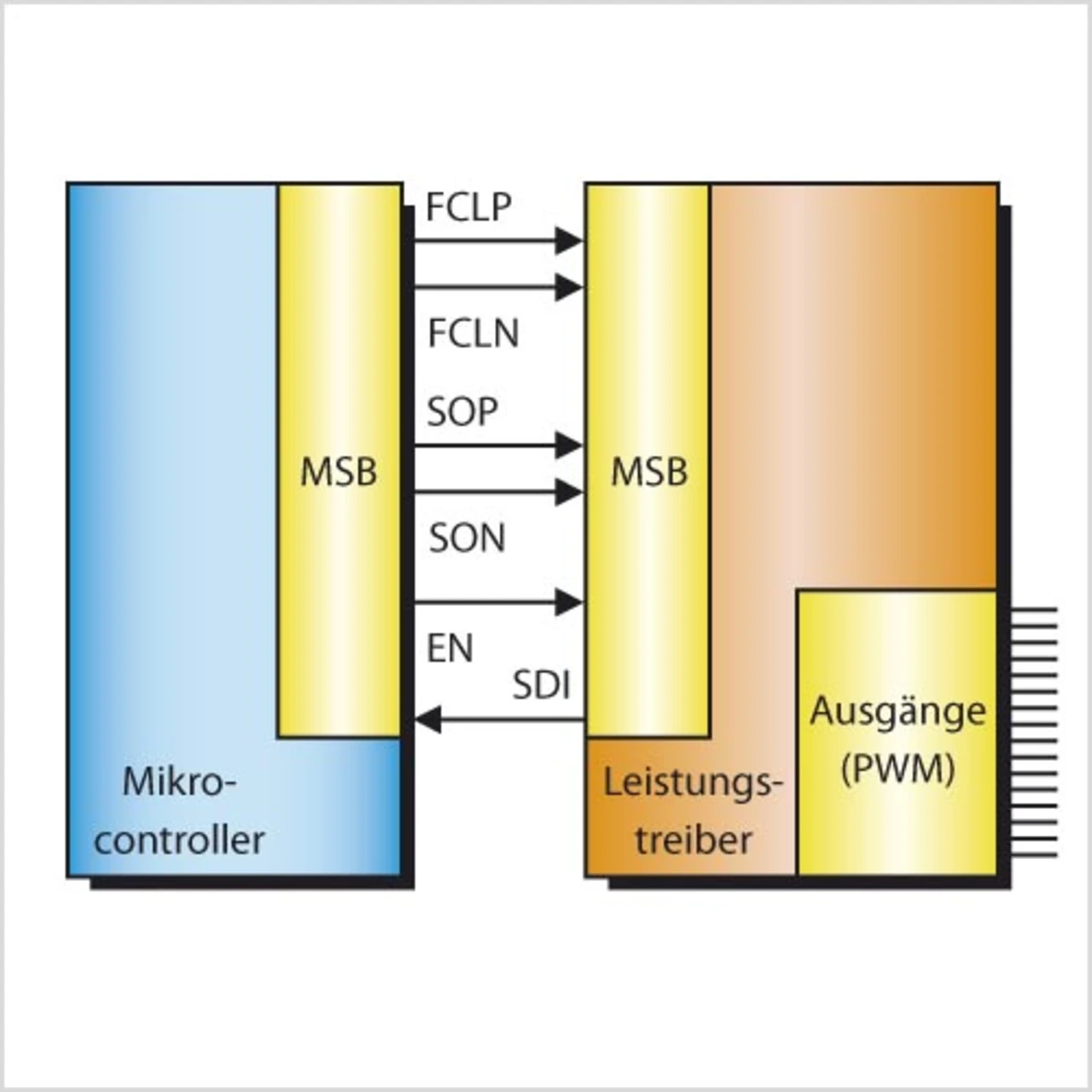 Der MSB optimiert den Datenaustausch und die Pin-Anzahl zwischen Mikrocontroller und Leistungstreiber-Baustein. Mit sechs Pins (bei LVDS) können verschiedene Arten von Informationen (PWM-Daten und Steuerdaten) über die gleiche Schnittstelle transferiert werden. Die Skalierbarkeit der Schnittstelle ist ein weiterer Vorteil. Mehrere Leistungstreiber-Bausteine können über einen MSB-Peripheriebaustein gesteuert werden. Ein weiterer Leistungstreiber-Baustein benötigt dabei nur einen weiteren Chip-Select-Pin.