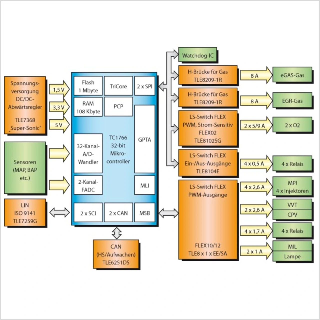 Solche Aspekte werden in der Bausteinfamilie „FLEX“ von Infineon Technologies berücksichtigt. Sie beinhaltet heute Bausteine mit zwei Kanälen: den TLE8102SG mit Strom-Sensierung für die Heizung der Lambda-Sonde und den TLE8104E für elektromagnetische Lasten wie Ventile oder Injektoren für die Einlasskanaleinspritzung. Die Bausteinfamilie FLEX 10/12 beinhaltet u.a. den TLE-8110EE mit sechs Kanälen für elektromagnetische Ventile und mit vier Kanälen z.B. für Relais und andere kleinere Lasten.