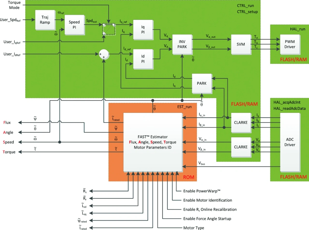 Ein besonderes Merkmal des FOC-Regelkreises ist der adaptive FAST-Algorithmus. Dieser ermittelt automatisch Flussdichte, Stromwinkel, Drehzahl und Drehmoment aus den Phasenspannungen und -strömen (Bild 5). Dank der automatischen Erkennung der Motorparameter können Entwickler einen neuen Motor schnell in Betrieb nehmen und sich bei der Feinabstimmung des Regelkreises auf das automatische System verlassen.