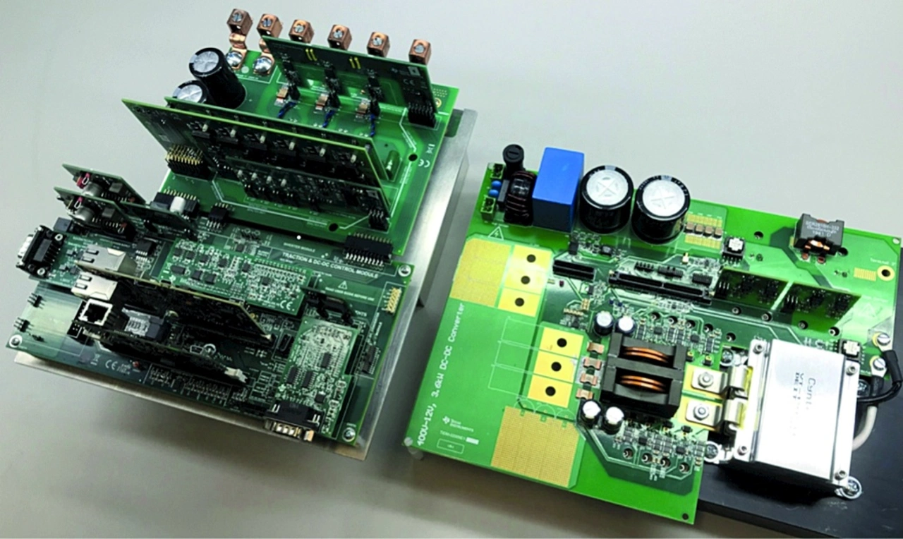 Der Traktionsumrichter verwendet einen Software-basierten Resolver-Digital-Wandler (RDC), um den Motor auf eine hohe Drehzahl von bis zu 20.000 Umdrehungen pro Minute (1/min) zu bringen. Die Leistungsstufe besteht aus dem Sechs-Wege-Leistungsmodul »CCS050M12CM2« von Wolfspeed, das auf SiC-FETs basiert und von dem intelligenten Gate-Treiber »UCC5870QDWJRQ1« von TI angesteuert wird. Ein modernes PWM-Modul mit integrierter Steigungskompensation im Komparator-Subsystem (CMPSS) erzeugt die PCMC-Wellenform. Der Spannungsmesspfad verwendet TIs Verstärker »AMC1311QDWVRQ1« mit extrastarker Isolation und 2-V-Eingängen, und der Strommesspfad verwendet TIs Präzisionsverstärker »AMC1302QDWVRQ1« mit extrastarker Isolation und Eingängen für ±50 mV.