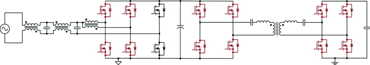 In Bild 7 steuert die passende Controllerkarte »TMDSCNCD28388D« (Mitte) den primärseitigen PFC-Zwischenkreis (links) und den sekundärseitigen CLLLC-Vollbrückenwandler mit Synchrongleichrichtung (rechts). Die schematische Darstellung dieses Entwurfs ist in Bild 8 zu sehen.