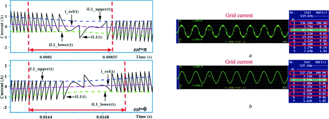 Das Beispiel eines Photovoltaik-Wechselrichters zeigt, wie effektiv HHC die Verzerrungen der Brückenschalttransistoren im Nulldurchgang reduziert (Bild 9, links) und damit sowohl Emissionen als auch Verzerrungen im Stromnetz eliminiert. Der hohe Klirrfaktor von 7,8 Prozent der 3. Harmonischen der sinusförmigen Netzspannung (Bild 9, oben rechts) wird durch den Einsatz von HHC auf 0,9 Prozent reduziert (Bild 9, unten rechts).
