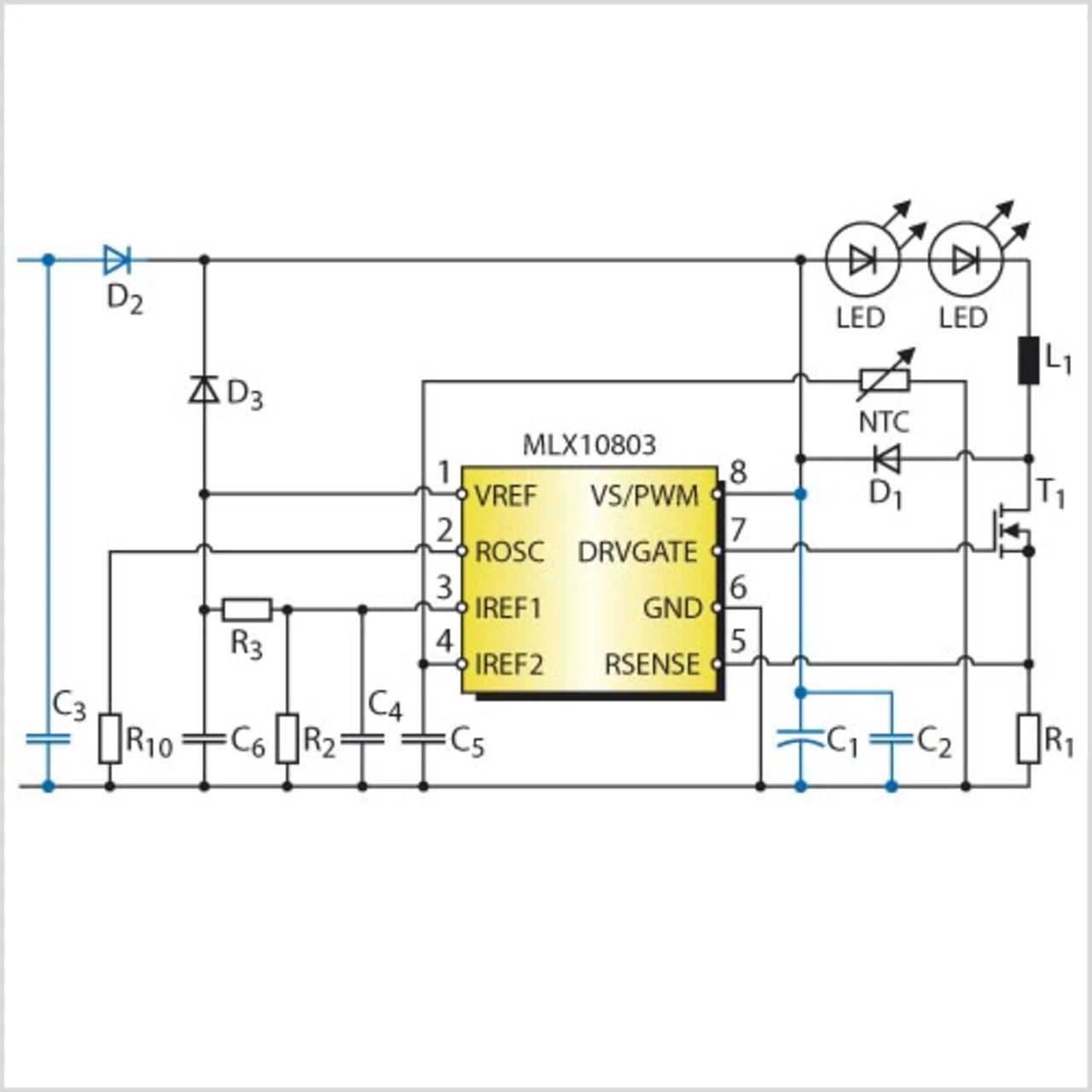 R1 ist der Messwiderstand, der den Spitzenstrom in eine Spitzenspannung umwandelt, die dem Eingang RSENSE zugeführt werden kann. R10 legt die Frequenz des internen Oszillators des MLX10803 fest. R2 definiert die am Eingang RSENSE zu erfassende Spitzenspannung. Der Eingang IREF steuert eine interne 50-µAStromquelle und bestimmt so die Spannung am Eingang RSENSE. L1, R1, R2 und R10 lassen sich mit Hilfe der „Coil Calc“-Excel-Tabelle von Melexis berechnen [1]. Die Werte hängen ab von der gewählten LED, von D1, von der gewünschten Frequenz und von der Wellenform der Regelung. Wichtigstes Kriterium bei der Wahl von D1 sollte es sein, HF-Störungen zu vermeiden. D2 ist unkritisch, doch muss diese Diode die erforderliche Sperrspannung verkraften. C4 verhindert, dass Störungen in den relativ hochohmigen Knoten einstreuen und der LED-Strom schwankt. Dieser Kondensator kann entfallen, wenn die Leitung zwischen dem Pin 3 des MLX10803 und dem Widerstand sehr kurz ist.
