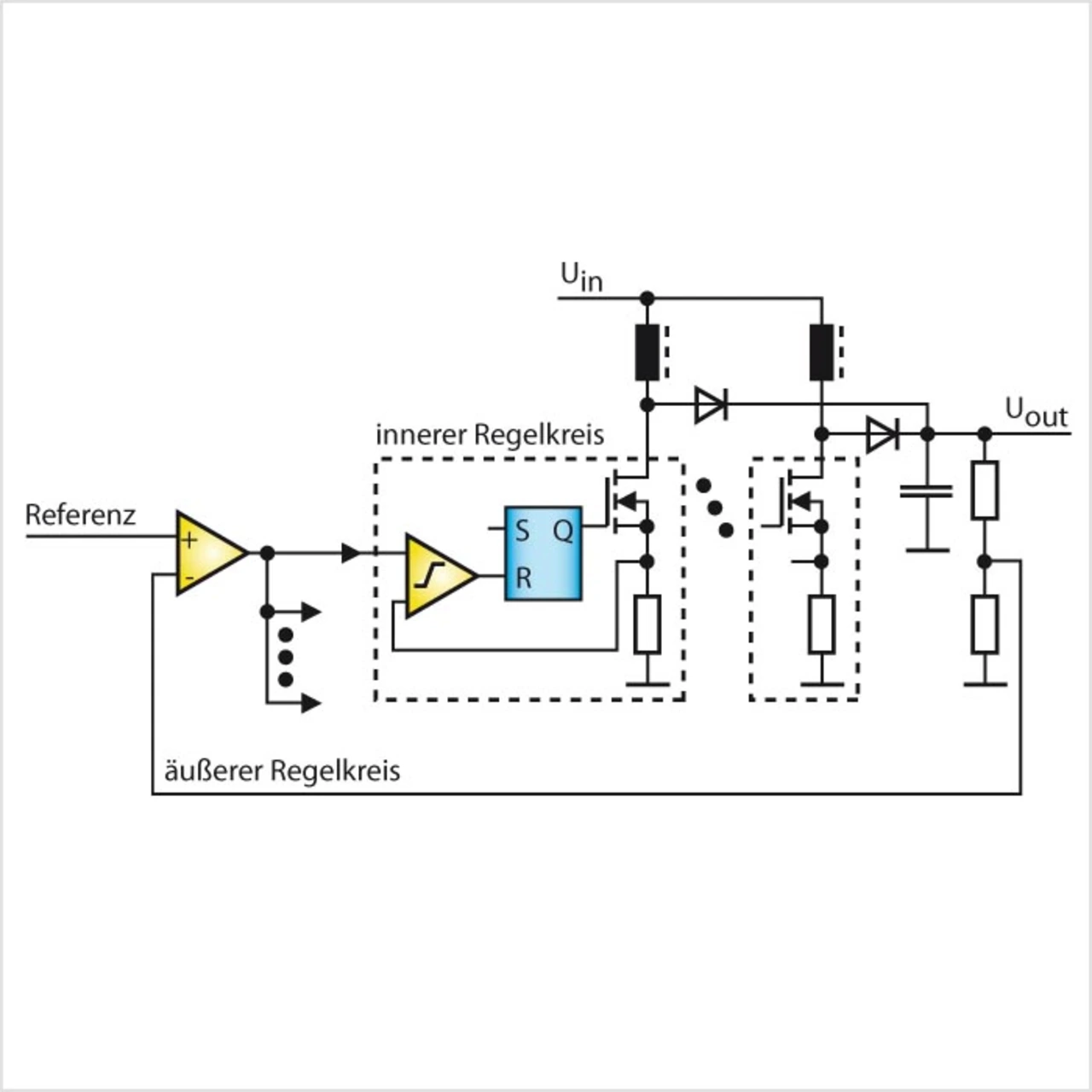 Die Abschaltung bei Erreichen eines vorgegebenen Stromwertes jeder einzelnen Phase wird als innerer Regelkreis bezeichnet (Bild 2). Der Schwellwert dazu wird vom Fehlerverstärker des äußeren Regelkreises vorgegeben, der die Ausgangsspannung oder den Laststrom mit einer präzisen Referenz vergleicht. Die Genauigkeit der Regelung wird bestimmt durch die Toleranz dieser Referenz, die Offset-Spannung des Regelverstärkers und die Präzision des externen Spannungsteilers bzw. Shunt-Widerstandes. Mit 1 % Toleranz der externen Komponente(n) werden bei der Spannungsregelung gegen die interne Referenz von 1,2 V ohne Abgleich ±2,5 % erreicht, bei Stromregelung gegen die niedrigere Referenz von 200 mV sind es ±5 %.