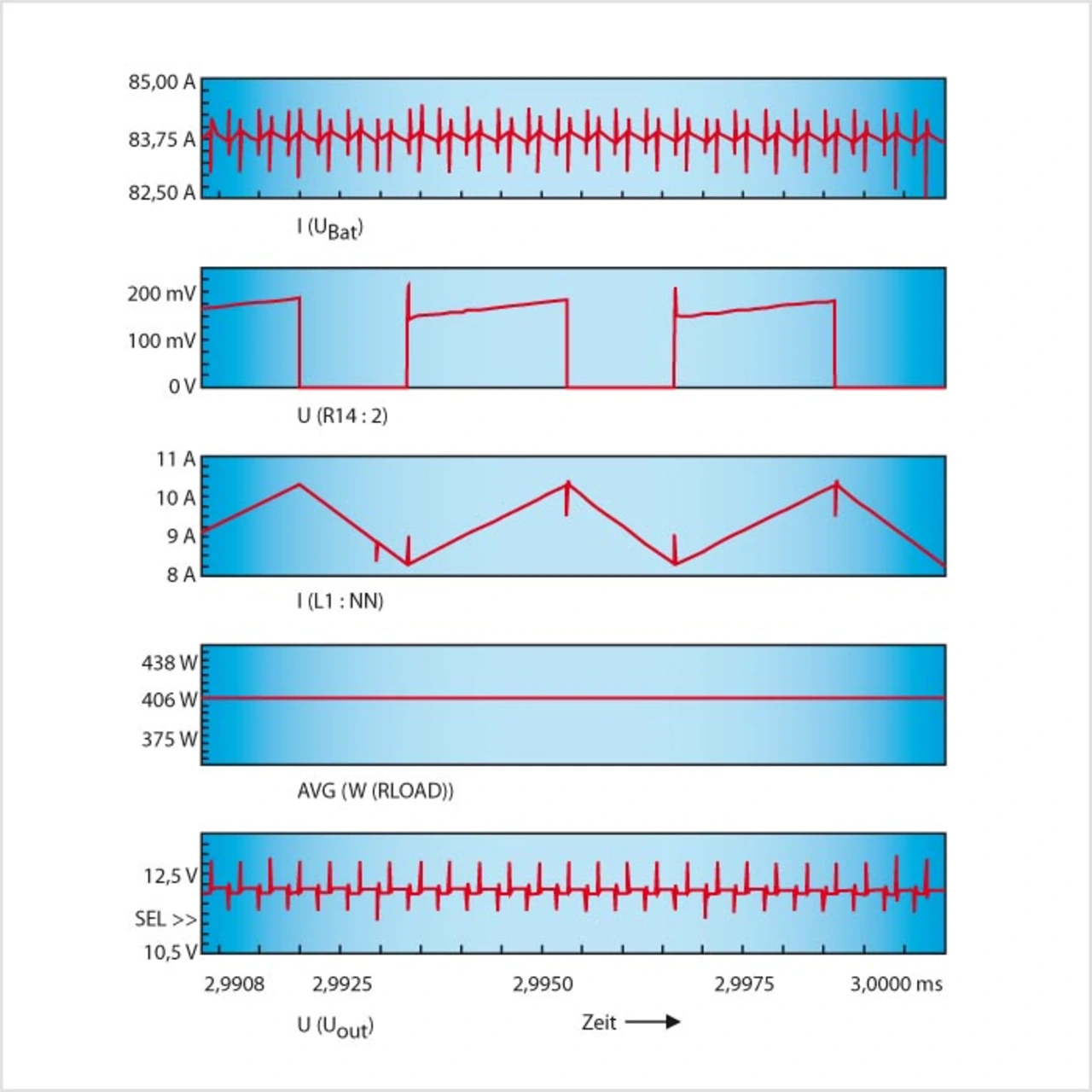 Mit den Vorteilen eines Multiphasensystems für die Bereitstellung hoher Leistungen bei hoher System-Schaltfrequenz bis zu 4,5 MHz ergeben sich kleinste Abmessungen, die Verwendung ausschließlich von SMD-Bauelementen auch für Spulen und Kondensatoren und eine außerordentlich hohe Leistungsdichte bei hoher Zuverlässigkeit und gutem Wirkungsgrad. Die Ergebnisse der Simulation eines 9-Phasen-Wandlers für eine Ausgangsleistung von 400 W zeigen dies anschaulich (Bild 4).