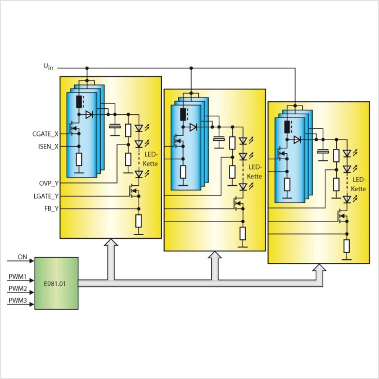 Das IC E981.01 der Elmos Semiconductor AG ermöglicht den Aufbau eines Konverters mit bis zu neun Phasen (Bild 3). Die erzielbare Ausgangsleistung hängt von den externen Bauteilen wie MOSFETs, Spulen und Dioden ab. Mit geeigneten Bauelementen sind Leistungen bis in den Kilowatt-Bereich erreichbar. Die Leistungsdichte ist hoch, weil auch für hohe Ströme SMD-Bauteile verwendet werden können. Der hohe Wirkungsgrad sorgt für geringe Verlustleistung, die zudem gleichmäßig über den Aufbau des Konverters verteilt wird. Es treten also keine „hot spots“ wie bei Einphasen-Konvertern auf. Mit einem Boost-Konverter lassen sich Spannungen bis ca. 60 V aus dem 12-V-Bordnetz darstellen; darüber wird der Duty-cycle der Ansteuerung sehr ungünstig. Werden höhere Ausgangsspannungen benötigt, empfiehlt sich die Flyback-Topologie, die von dem IC ebenso unterstützt wird wie die SEPIC-Topologie.