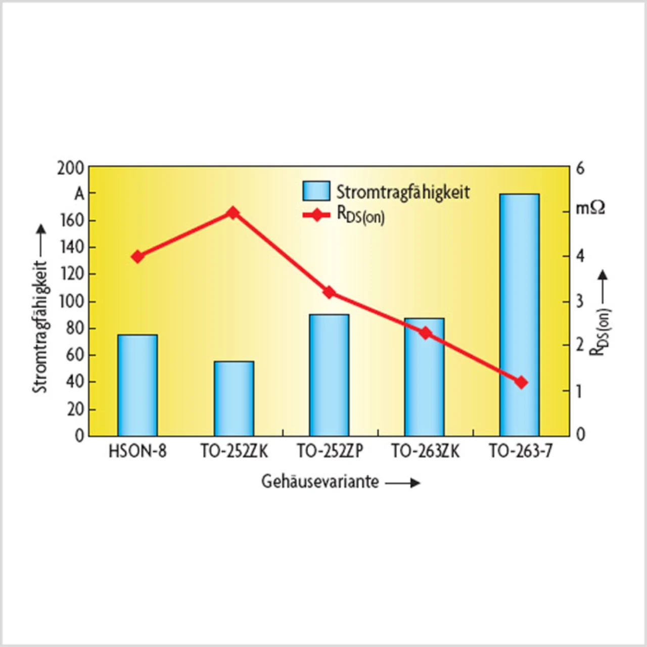 Neben dem Beitrag des Gehäuses wird RDS(on) hauptsächlich durch die Technologie und die Größe des verbauten Dies bestimmt. Bei maximaler Die-Größe kann im HSON-8 mit der 40-VUMOS-4-Technologie ein RDS(on) von 5,1 mΩ realisiert werden. Da im DPAK und D2PAK größere Dies verbaut werden können, werden in diesen Gehäusen auch kleinere RDS(on)-Werte erreicht (Bild 2).
